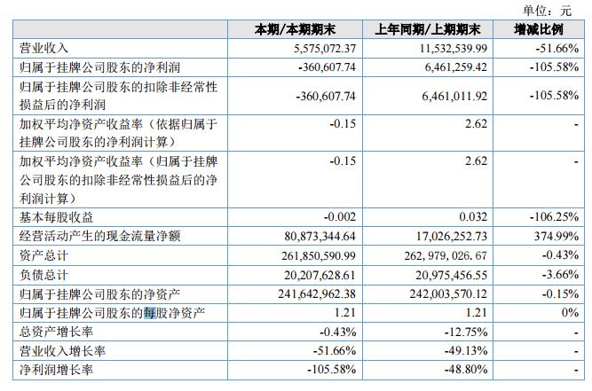 報告期,實現(xiàn)營業(yè)收入5,575,072.37元,較上年同期減少了51.66%;實現(xiàn)凈利潤-360,607.74元,較上年同期減少了105.58%。?