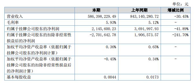 報(bào)告期內(nèi)公司實(shí)現(xiàn)營(yíng)業(yè)收入5.86億元,合并利潤(rùn)總額249.03萬(wàn)元,其中歸屬于母公司所有者凈利潤(rùn)為214.56萬(wàn)元,基本每股收益為0.0044元/股,經(jīng)營(yíng)活動(dòng)現(xiàn)金凈流量為-772.45萬(wàn)元。?