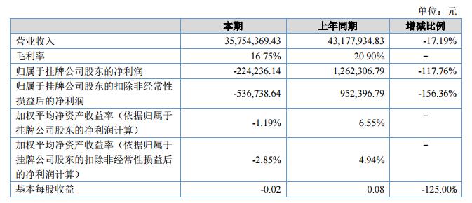報告期內(nèi),公司營業(yè)收入35,754,369.43元,比上年同期為43,177,934.83元同比減少17.19%,主要是因為受行業(yè)去產(chǎn)能政策和國家環(huán)保督察影響,公司產(chǎn)品生產(chǎn)供貨嚴(yán)重不足,從而使收入有所下滑。報告期內(nèi)凈利潤為-224,236.14元,上年同期為1,262,306.79元同比減少117.76%,主要原因是報告期內(nèi)銷售收入下降,毛利率下降,造成凈利潤同比下降。?