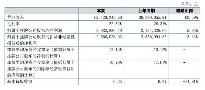 報告期內(nèi)公司實現(xiàn)營業(yè)收入62,420,243.60萬元,同比上升62.59%;毛利率為22.52%,比上年同期的28.31%有所下降;凈利潤與扣除非經(jīng)常性損益后的凈利潤分別為288.38萬元、256.60萬元,其中,凈利潤較上年同期增長5.85%。