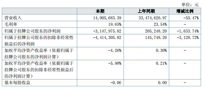本期公司實(shí)現(xiàn)營業(yè)收入1,490.57萬元,較上年同期3,347.46萬元下降55.47%,主要是因?yàn)?8年新年在2月份,17年新年在1月份,導(dǎo)致訂單貨期推遲了一個(gè)月左右,重要客戶的大部分產(chǎn)品主要在7月份開始才陸續(xù)出貨,因此本期確認(rèn)的收入大幅下降;營業(yè)成本1,197.61萬元,較上年同期2,559.51萬元下降53.21%,營業(yè)成本的下降趨勢與銷售收入減少保持一致;毛利率19.65%較上年同期23.54%下降3.89%;本年虧損314.80萬元,主要是因?yàn)樯习肽赇N售規(guī)模縮小,而部分成本費(fèi)用相對(duì)固定,公司盈利空間進(jìn)一步壓縮所致。?