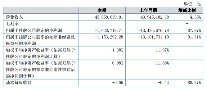 報(bào)告期內(nèi)營(yíng)業(yè)收入為45,858,059.01元,比去年同期增長(zhǎng)4.35%,歸屬于掛牌公司的股東凈利潤(rùn)-1,628,718.71元,比去年同期增加87.87%?;久抗墒找?0.05元,比去年同期增加88.37%。?