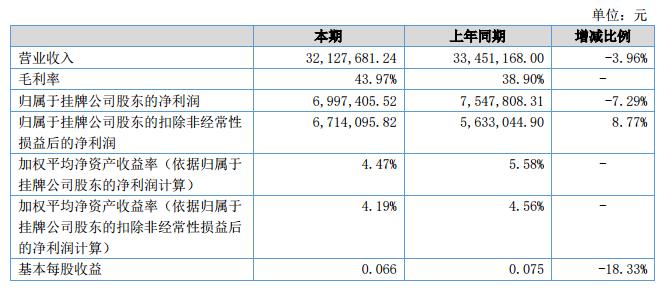 報告期內(nèi),公司實現(xiàn)營業(yè)收入32,127,681.24元,比去年同期下降3.96%,歸屬母公司凈利潤6,997,405.52元,比去年同期下降7.29%。?