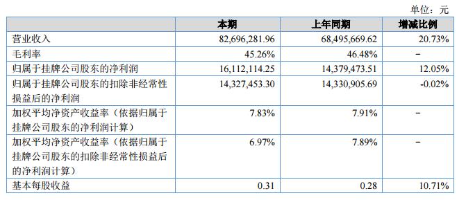報(bào)告期內(nèi),公司實(shí)現(xiàn)業(yè)務(wù)收入8,269.63萬元,同比上期增長了20.73%。凈利潤1,576.00萬元,同比上期增長了11.31%。?