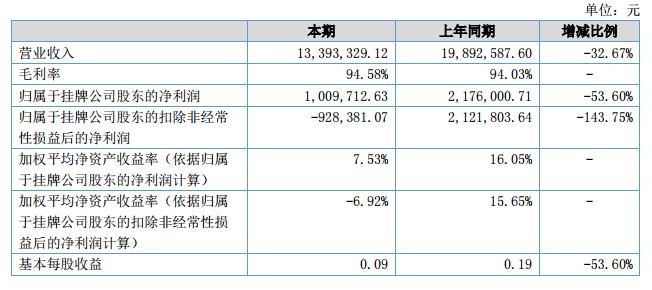 報(bào)告期內(nèi)公司營業(yè)收入為1,339.33萬元,較2017年同期下降649.93萬元,降幅32.67%,凈利潤為100.97萬元,較2017年同期減少116.63萬元,降幅53.60%。?