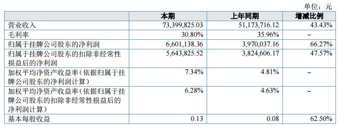 報(bào)告期內(nèi)公司實(shí)現(xiàn)營(yíng)業(yè)收入73,399,825.03元,同比增長(zhǎng)43.43%;凈利潤(rùn)為6,601,138.36元,同比增長(zhǎng)66.27%。?