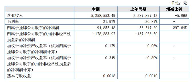 報(bào)告期內(nèi),公司實(shí)現(xiàn)營(yíng)業(yè)收入525.86萬(wàn)元,同比下降5.89%;營(yíng)業(yè)成本410.30萬(wàn)元,同比下降7.2%;毛利率21.97%,同比上升1.10%;凈利潤(rùn)13.34萬(wàn)元,同比上升297.64%。?
