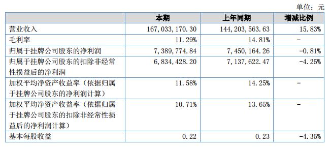 報告期內(nèi)公司銷售167,033,170.30元與去年同期相比增長15.83%;報告期內(nèi)實(shí)現(xiàn)凈利潤7,389,774.84元與去年同期相比下降0.81%。