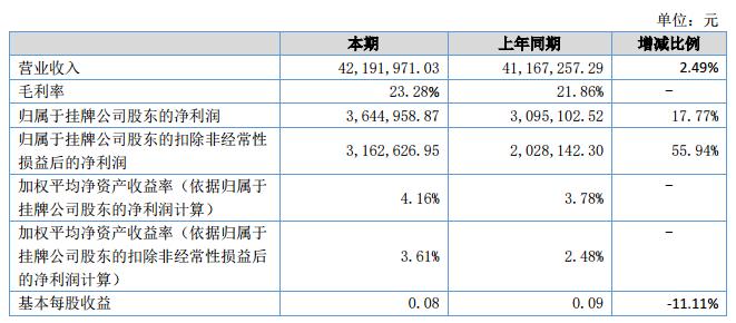 報(bào)告期內(nèi),公司實(shí)現(xiàn)營(yíng)業(yè)收入42,191,971.03元,較上年同期增長(zhǎng)2.49%;公司實(shí)現(xiàn)凈利潤(rùn)3,644,958.87元,較上年同期增長(zhǎng)17.77%。