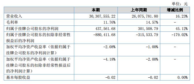 報(bào)告期內(nèi)公司實(shí)現(xiàn)營(yíng)業(yè)總收入30,307,555.22元,較去年同期增長(zhǎng)4,231,773.42元,同比增長(zhǎng)16.23%;凈利潤(rùn)-437,561.68元,虧損比上年同期上升45.12%。?