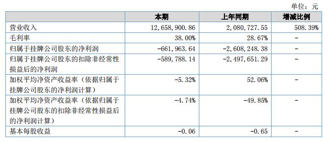 2018年半年度,實(shí)現(xiàn)營業(yè)收入12,658,900.86元,較上年同期增長508.39%,主要系公司抓住市場機(jī)遇,通過多年的運(yùn)營積累的客戶資源和技術(shù)實(shí)力,合同簽約量增長較快;同時(shí)帶來凈利潤水平的逐漸提高。2018年6月末資產(chǎn)總額為27,721,319.38元,較上年末增長13.00%,變動(dòng)不大;負(fù)債總額為15,382,952.30元,較上年末增長30.82%,主要系營業(yè)收入規(guī)模的增長帶來應(yīng)付賬款余額的增加;2018年6月末所有者權(quán)益余額為12,338,367.08元,較上年末下降3.41%,變動(dòng)不大;2018年6月末應(yīng)收賬款余額為12,777,200.71元,較上年末增長64.24%,主要系營業(yè)收入規(guī)模的增長。?