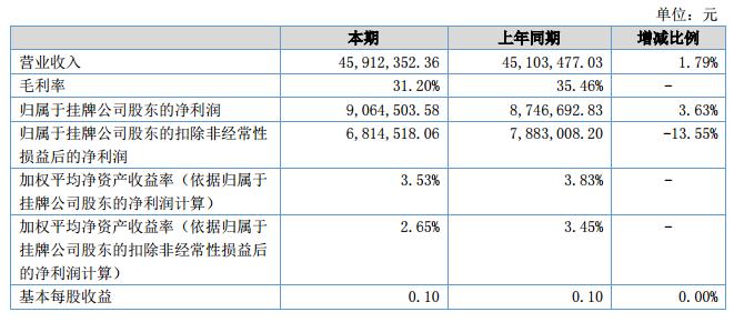 報(bào)告期內(nèi),公司實(shí)現(xiàn)營業(yè)收入4,591.24萬元,營業(yè)成本3158.87萬元;利潤總額和凈利潤分別為1,040.75萬元和906.45萬元,利潤總額比去年同期減少28.47萬元,同比負(fù)增長2.66%。凈利潤比去年同期增加31.78萬元,同比增長3.63%。截至2018年06月30日,公司總資產(chǎn)為34,676.84萬元,凈資產(chǎn)為26,234.92萬元。?