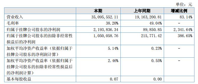2018年上半年營業(yè)收入目標3000萬元,由于擴大了經營范圍,增強了宣傳力度,實際完成35,095,552.11元,完成計劃的117%,營業(yè)收入比上期實現大幅增長;2018年上半年實現凈利潤219萬元,凈利潤比上期增長2,341.64%;報告期內總資產110,794,783.58元,去年同期總資產106,581,860.19元,較去年增長3.95%。?