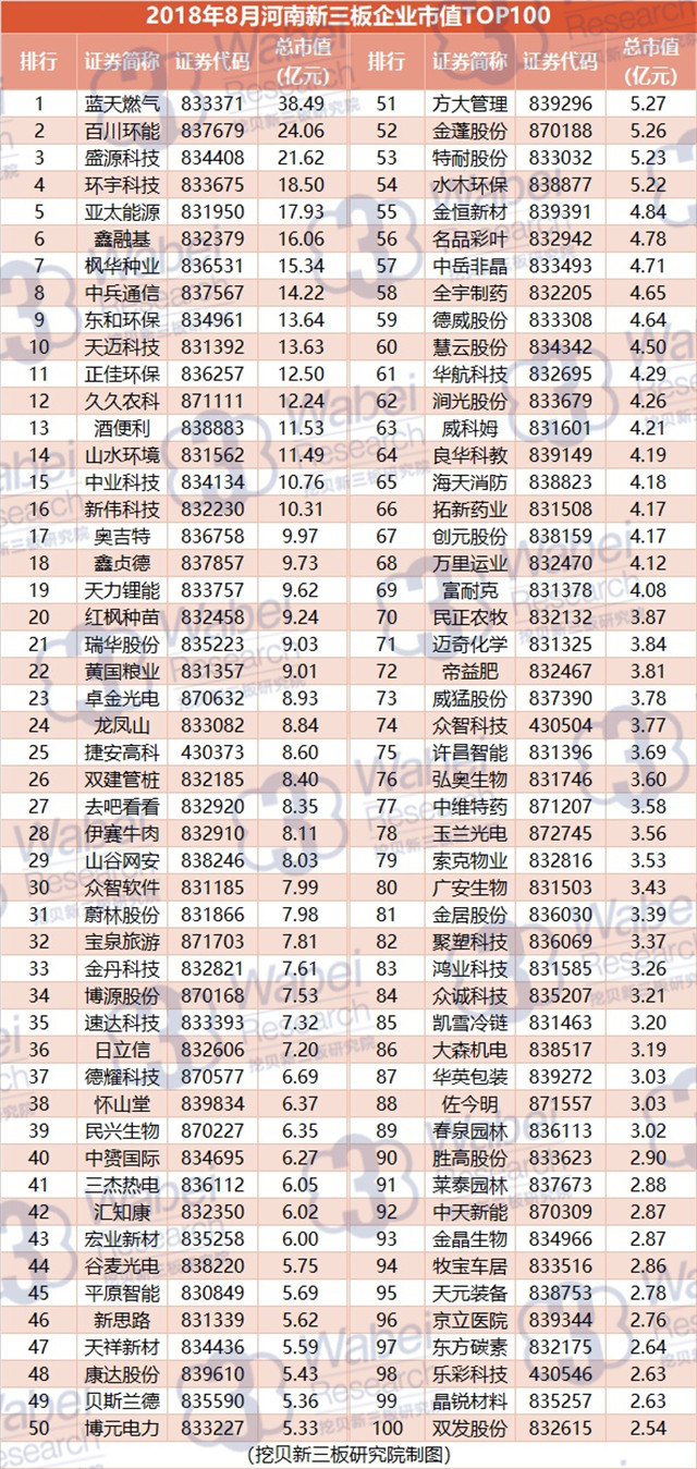 附:2018年8月河南新三板企業(yè)市值TOP100