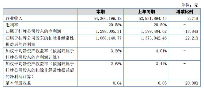報告期內(nèi)公司完成營業(yè)收入54,366,199.12元,較上年同期增長2.71%;實現(xiàn)凈利潤1,251,095.09元。公司營運能力:經(jīng)營活動產(chǎn)生的現(xiàn)金流量凈額為-1,882,147.33元,較上年同期降低了1,848,282.48元;存貨周轉率為3.17,較上年同期增長了23.90%,表明存貨管理能力加強,實現(xiàn)產(chǎn)品迅速流轉。?