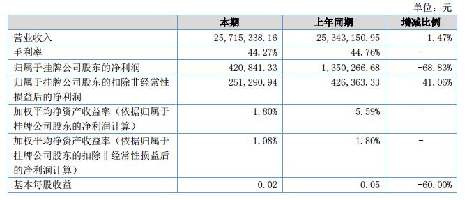 報告期內,公司實現(xiàn)營業(yè)收入2,571.53萬元,營業(yè)成本1,433.14萬元,凈利潤為42.08萬元,公司資產(chǎn)總額5,077.03萬元,凈資產(chǎn)2,363.58萬元,負債總額2,713.45萬元,,經(jīng)營活動產(chǎn)生的現(xiàn)金流量凈額-5.27萬元,投資活動產(chǎn)生的現(xiàn)金流量凈額79.95萬元,籌資活動產(chǎn)生的現(xiàn)金流量凈額-58.76萬元。?
