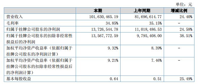 報告期內(nèi),公司實現(xiàn)營業(yè)收入10,163.05萬元,相較上年同期的8,169.66萬元,同比增長24.40%;公司實現(xiàn)凈利潤1,372.65萬元,相較上年同期的1,101.85萬元,同比上升24.58%。?