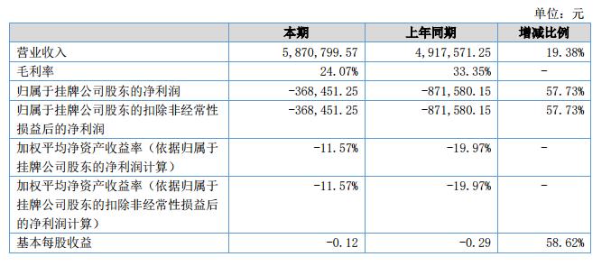 報告期內(nèi),公司實現(xiàn)營業(yè)收入5,870,799.57元,同比增長19.38%;凈利潤-368,451.25元,同比增長57.73%,主要原因是2018年上半年銷售額較2017年上半年增長19.38%,虧損明顯降低所致。?