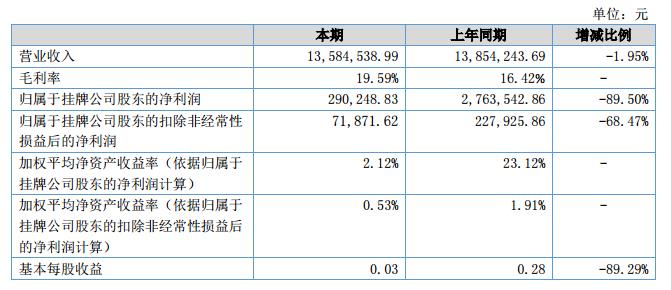 公司在2018年主營(yíng)業(yè)務(wù)保持平穩(wěn),實(shí)現(xiàn)營(yíng)業(yè)收入1358.45萬(wàn)元,較上年同期下降26.97萬(wàn)元,降幅1.95%,公司上半年出口銷(xiāo)售數(shù)量較上年同期略有增加,但是公司對(duì)于不同客戶給與不同的銷(xiāo)售折扣,由于公司的客戶集中度增加,大型客戶的銷(xiāo)售占比增加,銷(xiāo)售單價(jià)相對(duì)變低,致使銷(xiāo)售額未能同比增加。公司2018年上半年實(shí)現(xiàn)凈利潤(rùn)29.02萬(wàn)元,較上年大幅下降,主要是由于公司取得的政府補(bǔ)助大幅減少。?