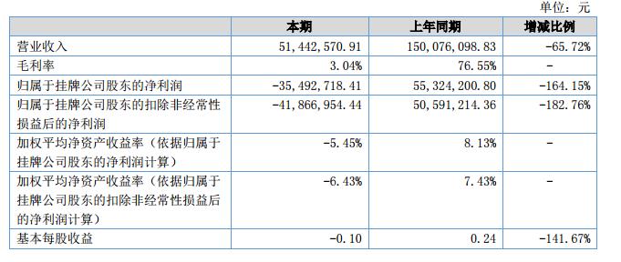 報(bào)告期內(nèi)公司實(shí)現(xiàn)營(yíng)業(yè)收入5,144.26萬(wàn)元,較上年同期15,007.61萬(wàn)元下降9,863.35萬(wàn)元;歸屬于母公司的凈利潤(rùn)為-3,549.27萬(wàn)元,較上年同期5,532.42萬(wàn)元下降9,081.69萬(wàn)元。