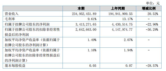 報告期內,實現營業(yè)收入23,495萬元,較上年同期19,494萬元,增長20.52%,實現凈利潤285萬元,較上年同期443萬元,下降35.67%,其主要由于人工成本大幅上升及材料價格上漲的影響。?