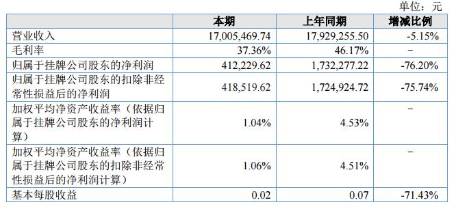 報告期內(nèi),公司實現(xiàn)營業(yè)收入為17,005,469.74元,較上期同比下降5.15%;實現(xiàn)凈利潤為412,229.62元,較上期同比下降76.20%;截止報告期末,公司賬面總資產(chǎn)為73,278,385.62元,歸屬于掛牌公司股東的凈資產(chǎn)為39,822,401.67元。?