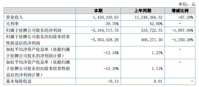 報(bào)告期內(nèi)公司實(shí)現(xiàn)營(yíng)業(yè)收入1,430,339.63元,較上年同期減少9,818,026.69元,同比減少87.28%;營(yíng)業(yè)成本861,685.76元,較上年同期減少5,662,797.76元,同比減少86.79%;報(bào)告期內(nèi)毛利率39.76%;營(yíng)業(yè)利潤(rùn)-5,363,428.28元,較上年同期減少5,829,699.58元,同比降低1,250.28%;公司實(shí)現(xiàn)凈利潤(rùn)-5,344,717.75元,較上年同期減少5,880,440.50元,同比降低1,097.66%。?
