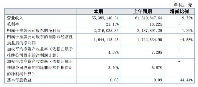 報告期內(nèi),公司實現(xiàn)營業(yè)收入55,389,140.34元,較去年同期的61,349,847.64元,同比下降了9.72%;實現(xiàn)凈利潤2,589,331.70元,較去年同期的2,205,309.96元,同比增加了17.41%。
