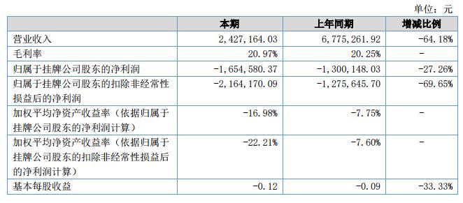 報告期內(nèi),公司營業(yè)收入2,427,164.03元,比上年同期下降64.18%;報告期內(nèi),營業(yè)成本1,918,187.72元,比上年同期下降64.50%。?