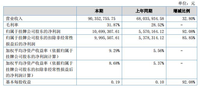 報(bào)告期內(nèi)公司實(shí)現(xiàn)營(yíng)業(yè)收入9,035.27萬元,比去年同期增加2,231.68萬元,增長(zhǎng)32.80%;2018年1-6月凈利潤(rùn)1,069.93萬元,比去年同期增加512.91萬元,增長(zhǎng)92.08%??傎Y產(chǎn)23,003.27萬元,比去年同期增加4,020.66萬元,增長(zhǎng)25.02%;歸屬于掛牌公司凈資產(chǎn)為12,049.68萬元;比去年同期增加1750.40萬元,增長(zhǎng)17.00%。?