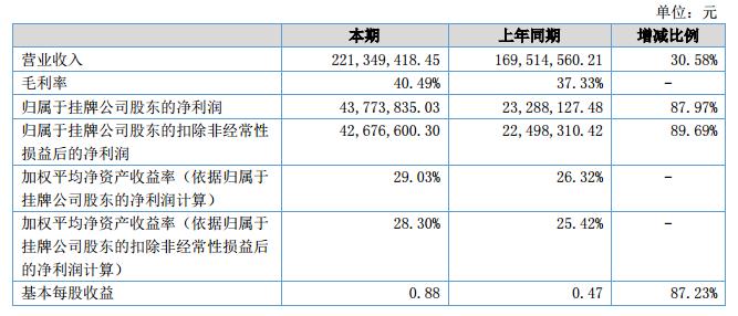 報告期內(nèi),公司實現(xiàn)銷售收入221,349,418.45元,上年同期為169,514,560.21元,增長30.58%;報告期內(nèi),公司實現(xiàn)凈利潤43,773,835.03元,上年同期為23,288,127.48,增長87.97%?。