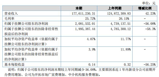 報告期內,公司實現(xiàn)營業(yè)收入177,611,230.31元,較2017年同期增長42.23%,主要原因系建筑工程設計服務收入增長較快;實現(xiàn)凈利潤2,081,532.01元,較2017年同期減少56.08%,主要原因系近一年內新設分公司前期開辦費增加、公司為開拓市場的業(yè)務廣宣費增加、中介機構服務費增加。?