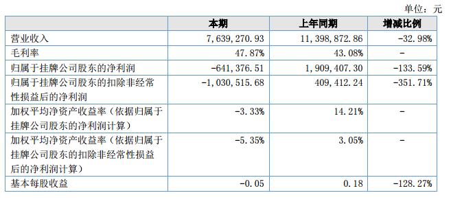 營業(yè)收入本期763.93萬元,同比減少375.96萬元,減少比例32.98%;實現(xiàn)的凈利潤-83.90萬元,上年同期為190.94萬元。?