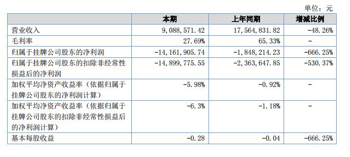 報(bào)告期內(nèi),公司的營(yíng)業(yè)收入908.86萬(wàn)元,同比下降48.26%;凈利潤(rùn)-1,416.19萬(wàn)元,同比下降666.25%。?