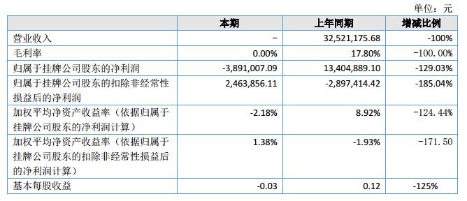 報告期內(nèi),公司因發(fā)展戰(zhàn)略需要,新的業(yè)務(wù)處于過渡階段,導(dǎo)致報告期內(nèi)新的業(yè)務(wù)尚未實現(xiàn)收入,實現(xiàn)營業(yè)收入0萬元,利潤總額-388.43萬元,歸屬于掛牌公司股東的凈利潤-389.10萬元,凈利潤較上年同期減少129.03%。減少的原因由于投資損失的增加,公司持有江蘇神山風(fēng)電設(shè)備制造有限公司21.37%的股權(quán),給公司造成了-245.29萬元虧損。?