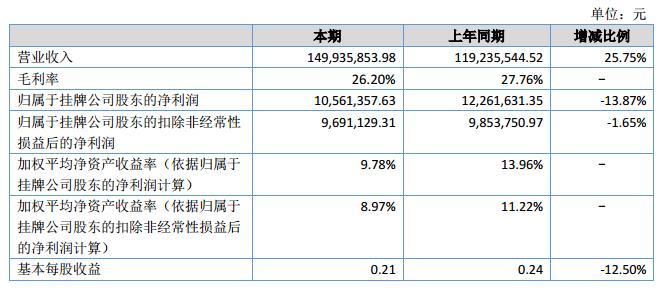 報(bào)告期內(nèi),公司實(shí)現(xiàn)營業(yè)收入149,935,853.98元,較上年同期增加25.75%,主要原因是國外市場開拓成效大業(yè)績上升;實(shí)現(xiàn)歸屬掛牌公司所有者凈利潤10,561,357.63元;公司總資產(chǎn)228,185,226.03元,較上年同期增加0.45%;歸屬掛牌公司所有者權(quán)益86,744,296.01元,較上年同期減少15.54%;經(jīng)營活動(dòng)產(chǎn)生的現(xiàn)金流量凈額-946,981.73元。?