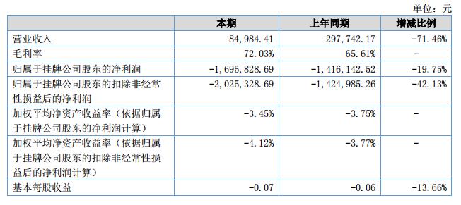 報(bào)告期末,公司總資產(chǎn)為62,955,345.88元,較上年末減少1.24%;凈資產(chǎn)為48,252,936.72元,較上年末減少3.4%;負(fù)債總額為14,702,409.16元,較上年末增加6.56%。報(bào)告期內(nèi),公司主營(yíng)業(yè)務(wù)收入為84,984.41元,較上年同期減少71.46%。報(bào)告期內(nèi),經(jīng)營(yíng)活動(dòng)產(chǎn)生的現(xiàn)金流量?jī)纛~為-1,601,951.00,較上年同期減少38.3%。?