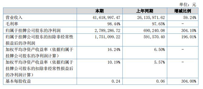 報(bào)告期內(nèi),公司實(shí)現(xiàn)營(yíng)業(yè)收入4161.90萬(wàn)元,同比增長(zhǎng)59.24%,歸屬于母公司的凈利潤(rùn)276萬(wàn)元,同比增長(zhǎng)299.91%。?