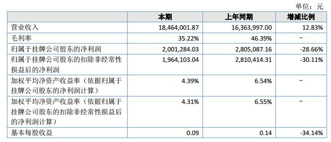 報告期內公司銷售收入為18,464,001.87元,營業(yè)總成本為16,150,412.38元,實現(xiàn)凈利潤2,001,284.03元。售收入同比增長12.83%,營業(yè)總成本同比增長20.5%,凈利潤同比增長-26.76%。經營活動產生的現(xiàn)金流量凈額為-319,571.99元,同比增長-96.10%。?