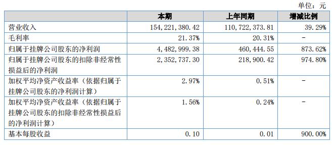 公司實現(xiàn)營業(yè)收入154,221,380.42元,較上年同期增加39.29%;公司營業(yè)成本121,256,986.22元,較上年同期增加37.43%;公司凈利潤4,482,999.38元,較上年同期增加873.62%。?