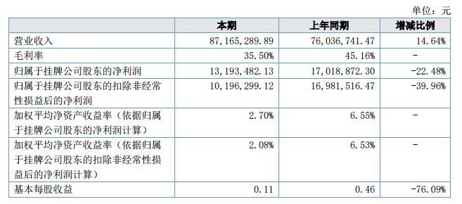 報(bào)告期內(nèi)公司實(shí)現(xiàn)營業(yè)收入8,716.53萬元,較上年同期增加了1,112.85萬元,增長比例14.64%;實(shí)現(xiàn)凈利潤13,282,314.74元,較上年同期下降3,736,557,56元,同比下降。?