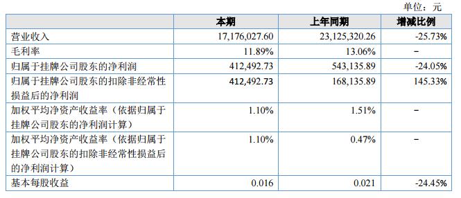 報告期內(nèi)公司實(shí)現(xiàn)營業(yè)收入17.176.027.60元,比去年同期減少25.73%,歸屬母公司凈利潤412,492.73元,同比減少24.05%,受中美貿(mào)易戰(zhàn)影響,今年公司訂單較往年減少,因此上半年盈利低于往年,下半年利潤增長也不容樂觀。?