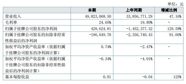 報告期內(nèi),公司實現(xiàn)營業(yè)收入49,728,620.03元,較上年同期增加15,871,848.74元,增長幅度為46.88%,增幅較大的主要原因是由于產(chǎn)品市場回暖,銷售數(shù)量增加,銷售單價同比上升;報告期內(nèi),公司營業(yè)成本為37,442,531.64元,同比增加10,292,314.04元,增幅為37.91%,增幅較大的原因是本期市場需求量增加,銷量有所增加,同時材料價格上漲,導(dǎo)致產(chǎn)品成本增加。報告期內(nèi),實現(xiàn)歸屬于掛牌公司股東的凈利潤429,624.81元,同比增加1,883,318.69元,本期利潤實現(xiàn)扭虧的主要原因是產(chǎn)品銷量增加,售價提升。?