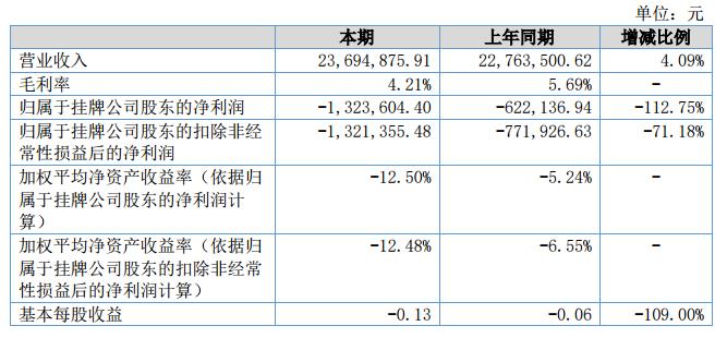 2018年上半年,公司的營業(yè)總收入為23,694,875.91元,比上年同期增加931,375.29元,增長4.09%;實(shí)現(xiàn)凈利潤-1,323,604.40元,比上年同期減少701,467.46元,減少112.75%。?