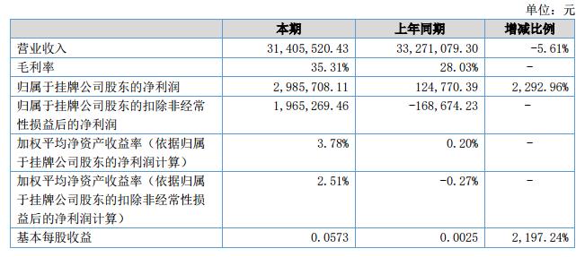 報(bào)告期內(nèi),公司實(shí)現(xiàn)營業(yè)收入31,405,520.43元,同比降低了5.61%;營業(yè)成本為20,315,463.76元,同比降低了15.16%;實(shí)現(xiàn)凈利潤2,985,708.11元,同比提高了2,292.96%。?