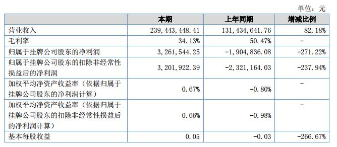 報(bào)告期內(nèi),公司實(shí)現(xiàn)營(yíng)業(yè)收入2.3億元,較上年同期增長(zhǎng)82.18%,實(shí)現(xiàn)凈利潤(rùn)113.48萬元,歸屬于掛牌公司的股東凈利潤(rùn)326.15萬元。截止報(bào)告期末,公司總資產(chǎn)為13.66億元,凈資產(chǎn)為4.87億元,注冊(cè)資本為6,075萬元。?