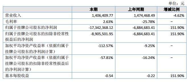 報告期內(nèi)公司實現(xiàn)營業(yè)收入1,406,409.77元,比上年同期減少4.62%;截至2018年6月30日,公司總資產(chǎn)為63,162,185.02元,凈資產(chǎn)為6,734,271.07元,同比下降10.87%和72.03%。報告期,歸屬于掛牌公司股東的凈利潤為-17,342,368.12元,同比下降151.96%。?