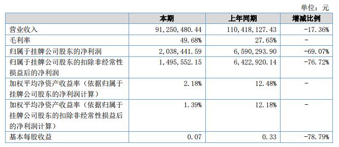 報(bào)告期末,公司營(yíng)業(yè)收入為9,125.05萬(wàn)元,同比上年同期下降17.36%;歸屬于掛牌公司股東的凈利潤(rùn)為203.84萬(wàn)元,同比上年同期下降了69.07%,主要原因是公司營(yíng)業(yè)收入同比上年同期減少1916.76萬(wàn)元。?