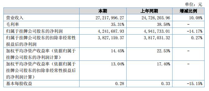 報(bào)告期內(nèi),公司營業(yè)收入27,217,996.27元,同比增長10.08%;營業(yè)成本17,608,650.43元,同比增長15.94%;凈利潤4,241,687.93元,同比下降14.17%;資產(chǎn)總額40,356,535.86元,比上年度末增長14.45%;負(fù)債總額8,881,806.71元,比上年度末增長10.65%;所有者權(quán)益總額31,474,729.15元,比上年度末增長15.58%;經(jīng)營活動產(chǎn)生的現(xiàn)金流量凈額2,464,230.46元,同比增長89.54%。?