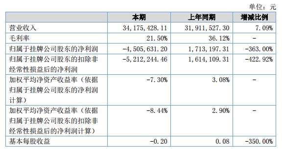 報(bào)告期,公司實(shí)現(xiàn)營(yíng)業(yè)收入34,175,428.11元,同比上升7.09%;歸屬于母公司所有者的凈利潤(rùn)-4,505,631.20元,同比下降363%;經(jīng)營(yíng)活動(dòng)產(chǎn)生的現(xiàn)金流量?jī)纛~-8,462,753.79元,同比上升47.92%。?